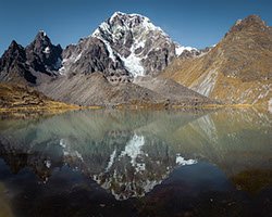 El nevado Ausangate, uno de los cinco nevados más altos de Perú, se encuentra en lo alto del circuito de las 7 Lagunas y provee de agua a las lagunas.